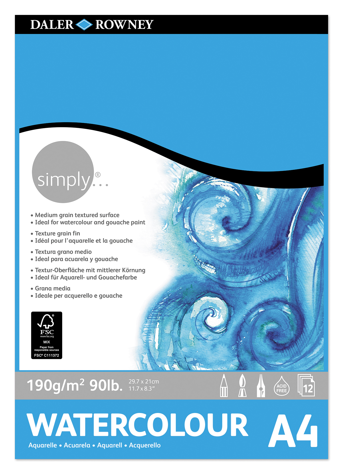 A medium grain textured surface paper, ideal for watercolour and gouache paint. Pads are gummed at the top for easy removal of pages.