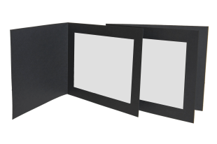 This premium middleweight matt black slip-in folder has an embossed surface with matching overlay and a single de-bossed line around the aperture with a plain black front